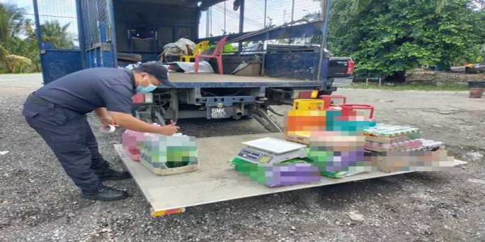 Tong gas, beras, alat penimbang, mesin juruwang, payung dan khemah antara barangan dirampas di kedai runcit yang diserbu.