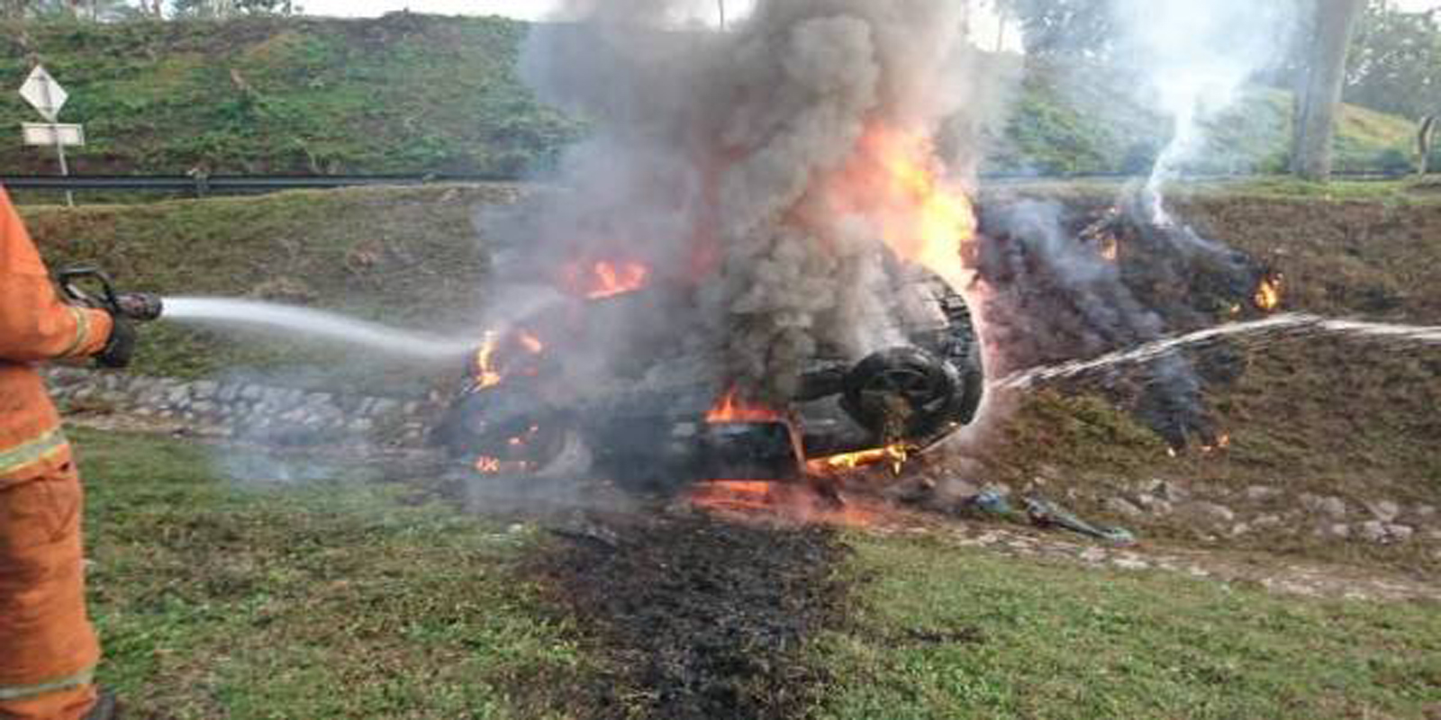 Dalam kejadian pada jam 7.25 pagi, Proton Satria Neo dipandu R Ganesh, 47, hilang kawalan sebelum terbalik lalu terbakar di bahu jalan.