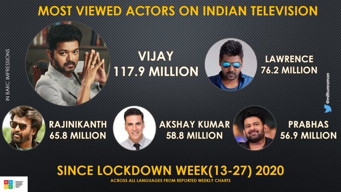 அதில் 117.9 மில்லியன் பார்வையாளர்களுடன் விஜய் முதலிடம் பிடித்துள்ளார். 76.2 மில்லியன் பார்வையாளர்களுடன் லாரன்ஸ் 2-ம் இடமும், 65.8 மில்லியன் பார்வையாளர்களுடன் ரஜினி மூன்றாவது இடத்தையும் பிடித்துள்ளார். அக்ஷய் குமார், பிரபாஸ் ஆகியோர் முறையே 4-வது மற்றும் 5-வது இடத்தை பிடித்துள்ளனர்.