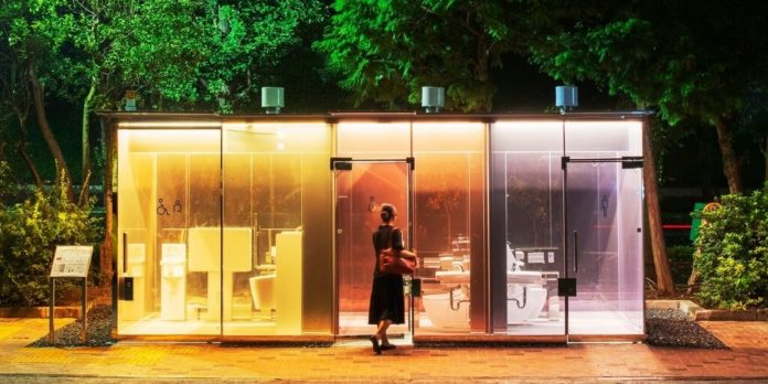 தலைநகர் டோக்கியோவின் வணிகப் பகுதியான ஷிபூயாவில் உள்ள இரண்டு பூங்காக்களில் கண்ணாடி சுவர்களால் ஆன, அழகான விளக்கு போல ஒளிரும் வெளிப்படையான பொது கழிப்பறைகள் நிறுவப்பட்டுள்ளன. வெளியில் இருந்து பார்க்கும்போது இந்த கழிப்பறைகள் வெளிப்படையாக தெரியும். யாரேனும் ஒரு நபர் உள்ளே நுழைந்தால் அது ஒளிபுகாதவாறு மாறும் என்பதுதான் இதன் சிறப்பு அம்சம்.