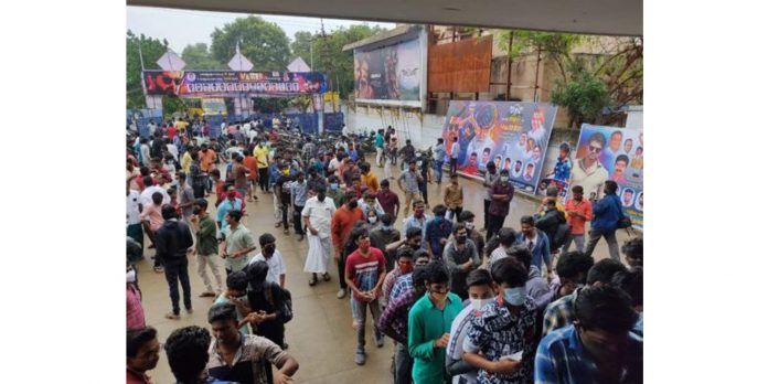 பலரும் இருக்கைகள் கிடைக்காமல் நின்றபடியே படம் பார்த்தனர். கரோனா காரணமாக விதிக்கப்பட்ட கட்டுப்பாடுகள் எதுவும் பின்பற்றப்படவில்லை.