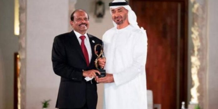 அபுதாபி பட்டத்து இளவரசர் ஷேக் முகமது பின் சயீத் அல் நஹ்யான் இவ்விருதை நேற்று முன்தினம் வழங்கி கவுரவித்தார்.