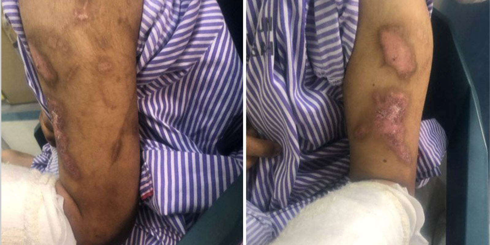 Mangsa mempunyai kesan melecur di dada, tangan, leher dan peha serta kesan luka. Mangsa telah dihantar ke Hospital Kuala Lumpur untuk pemeriksaan. Hasil pemeriksaan, doktor mengesahkan bahawa mangsa mengalami kecederaan ‘infected burn wound over bilateral forearm and multiple old scars all over body.’ Mangsa juga didapati positif Covid-19.