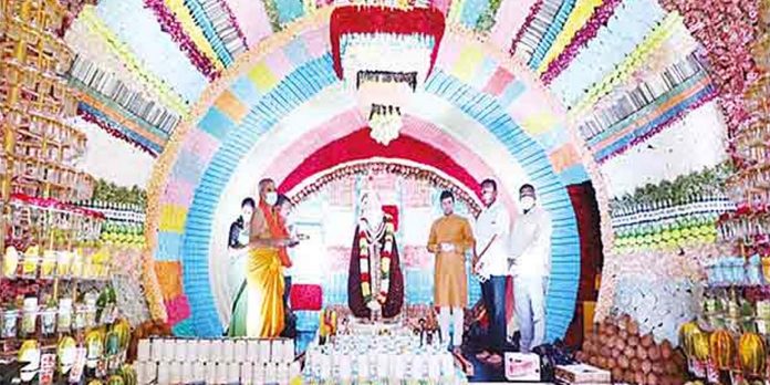 சாய்பாபாவுக்கு 3 லட்சம் மாத்திரைகள், 10 ஆயிரம் முகக்கவசங்கள், 2 ஆயிரம் சானிடைசர் பாட்டில்கள் , உணவு தானியங்கள், பழங்கள், இதர உணவு பொருட்களைக் கொண்டு சிறப்பு அலங்காரம் செய்யப்பட்டு பூஜை நடத்தப்பட்டது.