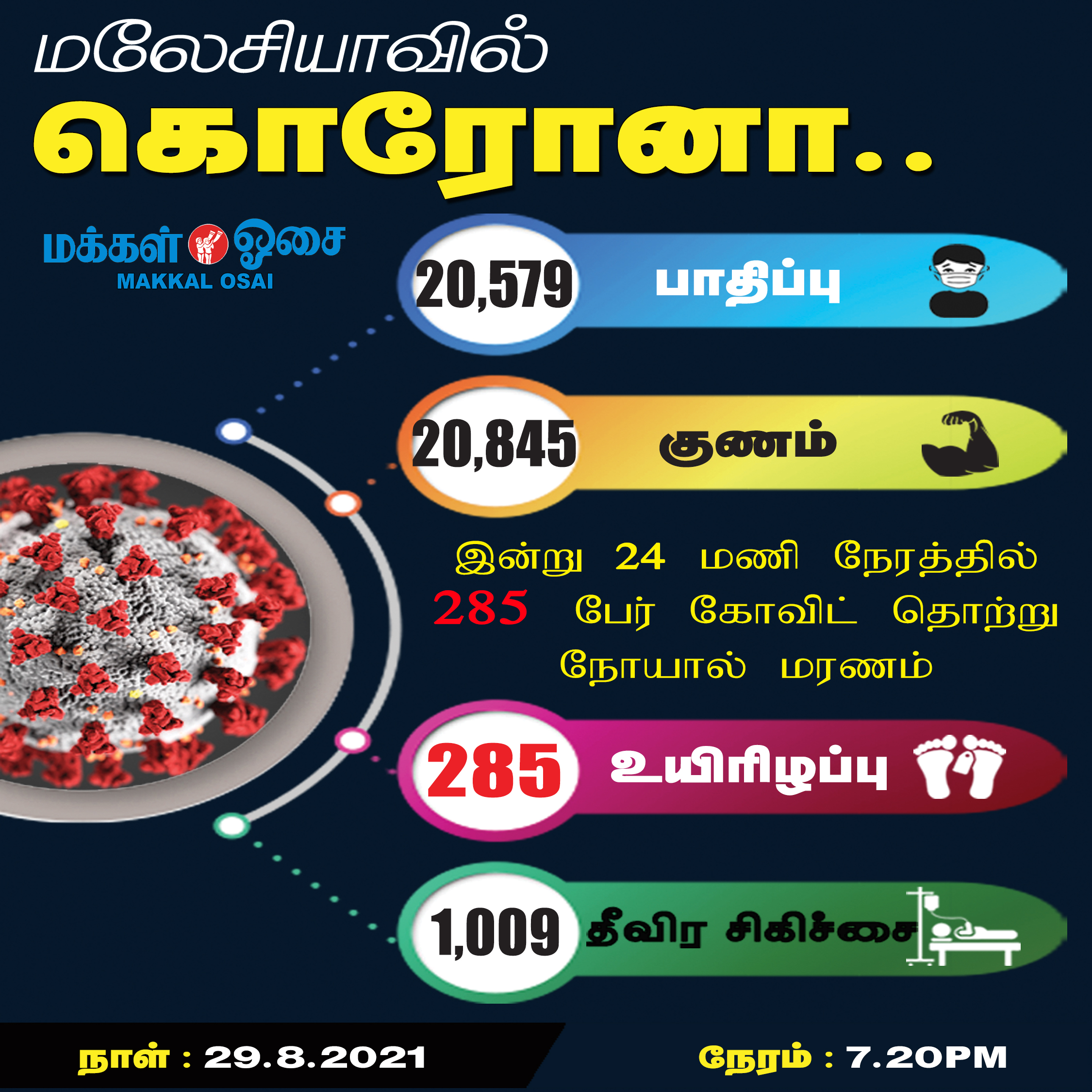 பெட்டாலிங் ஜெயா: கடந்த 24 மணி நேரத்தில் 20,579 பேர் புதிதாக கோவிட் -19 தொற்றுக்கு உள்ளாகியுள்ளனர். மற்றும் 285 பேர் இந் நோய்க்கு பலியாகியுள்ளனர் என்று சுகாதார அமைச்சகம் தெரிவித்துள்ளது.