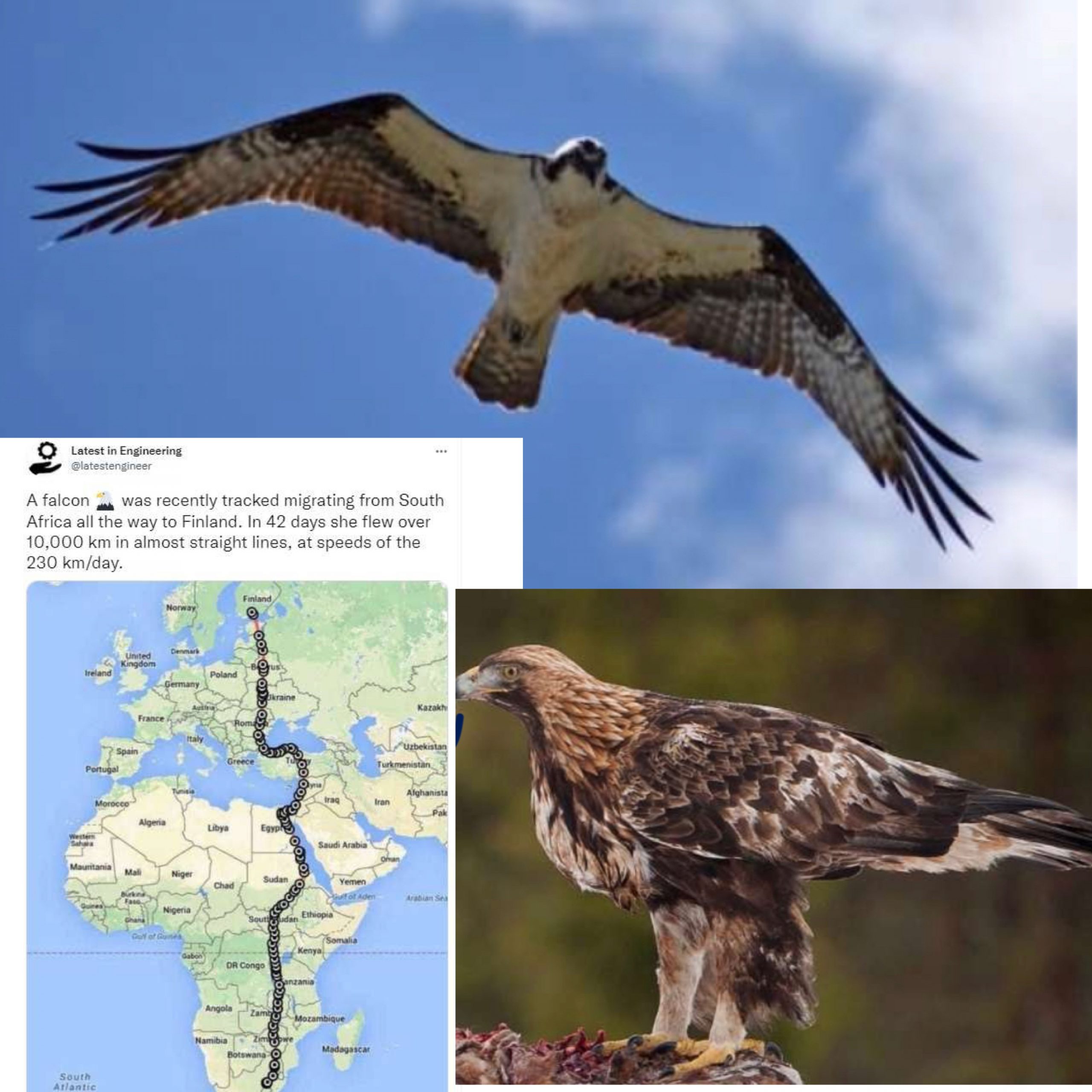 இதோ விஷயம் இதுதான். உலகின் அதிவேக பறக்கும் பறவை என்று அழைக்கப்படுவது falcon கழுகு, அதாவது வல்லூறு. இப்படித்தான் நாம் பார்க்க உள்ள இந்த ஹீரோ கழுகு தென் ஆப்பிரிக்காவிலிருந்து ஐரோப்பாவிற்கான பயணத்தை வெறும் 42 நாட்களில் முடித்துள்ளது. இதில் என்ன ஆச்சரியம் என்கிறீர்களா.