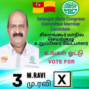 சிலாங்கூர் மாநில ம.இ.கா. நிர்வாகப் பொறுப்புக்கான தேர்தலில் போட்டியிடுவதால் கட்சி பொறுப்பாளர்கள் தம்மை தேர்வு செய்வார்கள் என்று பெக்கான் பண்டார் பாரு சுங்கை பூலோ ம.இ.கா. கிளைத் தலைவர் மு.ரவி நம்பிக்கை தெரிவித்தார். ம.இ.கா.தான் என் மூச்சு என்று இன்றுவரை கடமையாற்றி வருகின்றேன். கட்சித் தலைமைத்துவம் இடுகின்ற உத்தரவுகளை ஏற்று அதன்படி கடமைகளை ஆற்றி வருகின்றேன் என்றார்.