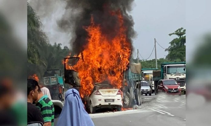 நேற்று, புரோத்தோன் பெர்சோனா கார் மற்றும் மண் ஏற்றிச் சென்ற லோரி மோதிய விபத்தில் இரு வாகனங்களும் தீப்பற்றி எரிந்ததில், காருக்குள் சிக்கிக்கொண்ட இருவர் உடல்கருகி உயிரிழந்ததாக ஊடகங்கள் செய்தி வெளியிட்டிருந்தது குறிப்பிடத்தக்கது.