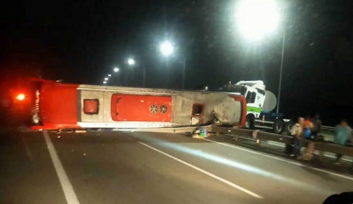 இதன் விளைவாக, விரைவு பேருந்து பின்னர் சறுக்கி எதிர் திசையில் கவிழ்ந்தது, இதனால் மூன்று பயணிகள் லேசான காயமடைந்தனர்” என்றும், டேங்கர் லோரி ஓட்டுநருக்கு காயம் ஏற்படவில்லை என்றும் அவர் கூறினார்.
