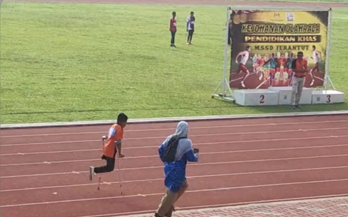 @faridkamaruddin18 என்ற பயனரால் TikTok இல் பகிர்ந்த 48 வினாடிகள் கொண்ட வீடியோ, ஊன்றுகோலில் ஒரு கால் சிறுவன் உட்பட ஐந்து பள்ளி மாணவர்கள் ஓடும் பாதையில் பந்தயத்தில் பங்கேற்பதைக் காட்டியது.
