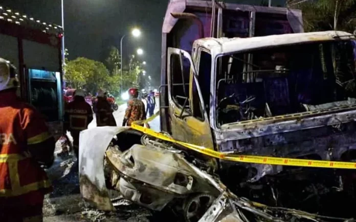 Nahas membabitkan kereta Proton Perdana dinaiki tiga individu yang terbakar apabila merempuh bahagian hadapan lori sampah.