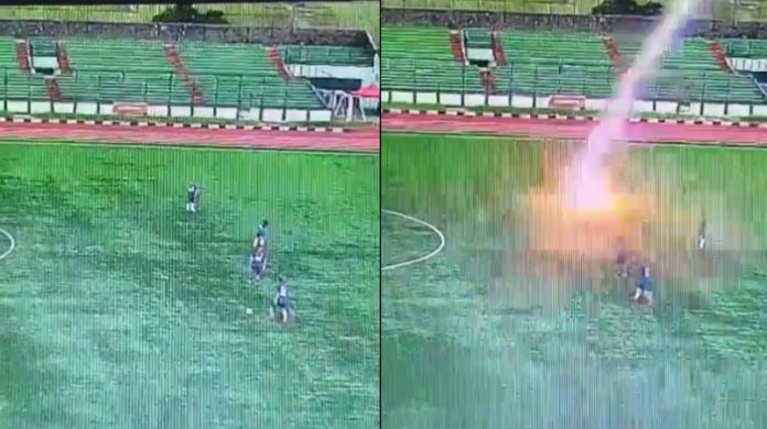 மின்னல் தாக்கியதன் காரணமாக கால்பந்து வீரர் பரிதாபமாக உயிரிழந்தது சக வீரர்களை அதிர்ச்சியிலும் சோகத்திலும் ஆழ்த்தியுள்ளது. கால்பந்து வீரரை மின்னல் தாக்கும் வீடியோ காட்சிகள் தற்போது வெளியாகி அதிர்ச்சியளிக்கும் வகையில் உள்ளன. கால்பந்து போட்டியின்போது இதுபோன்ற சோகமான சம்பவம் நடப்பது இது முதல் முறையல்ல.