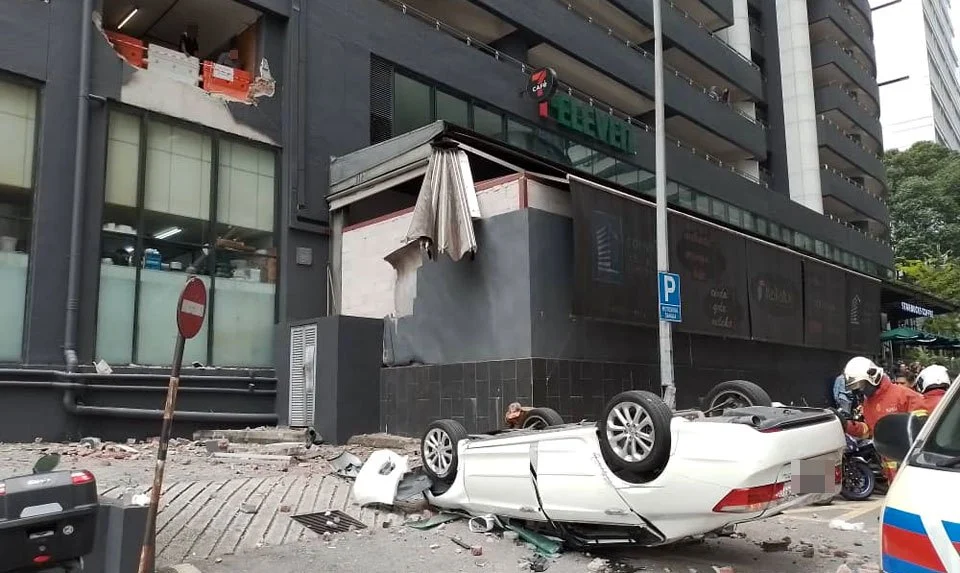 Seorang wanita cedera apabila kereta dipandunya dipercayai melanggar tembok penghadang sebelum terjunam dari tingkat satu tempat parkir sebuah premis perniagaan di Jalan P Ramlee, di sini, semalam.