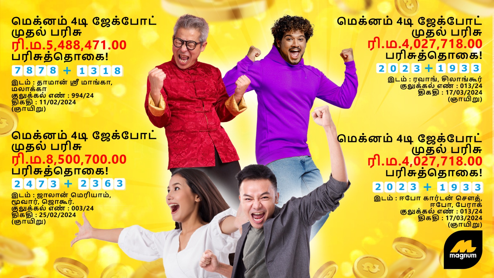 இரண்டே மாதங்களில் மெக்னம் ஜேக்போட் மூலம் புதிதாக நால்வர் லட்சாதிபதியாகி இருக்கின்றனர். Magnum 4D Jackpot மூலம் இவர்களுக்கு மொத்தம் 22 மில்லியன் ரிங்கிட் பரிசுத் தொகை கிடைத்திருக்கிறது.