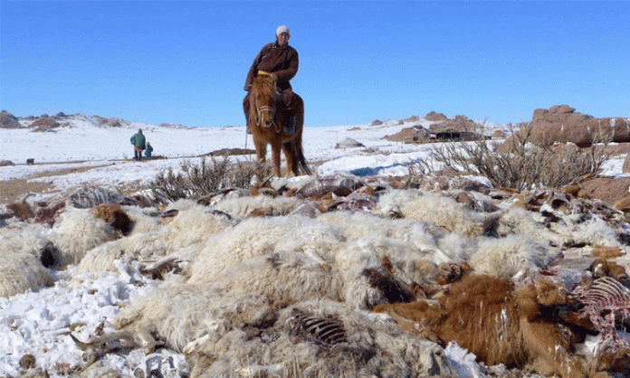 இதன் காரணமாக அங்குள்ள மாகாணாங்களில் கடுமையான பனிப்பொழிவு நிலவுகிறது. இதன் காரணமாக மங்கோலியா நாடு முழுவதும் பனியால் உறைந்து உள்ளது. விளைநிலங்கள், மேய்ச்சல் நிலங்கள் ஆகியவை பனிப்புயலுக்கு சேதமடைந்தன. இதனால் அங்கு உணவு பொருட்கள் உற்பத்தி செய்ய முடியாமல் பொதுமக்கள் தவித்து வருகிறார்கள். இந்தநிலையில் கடுமையான வறட்சி காரணமாக ஏற்பட்டுள்ள உணவு பொருள் தட்டுப்பாட்டால் மங்கோலியாவில் 70 லட்சம் கால்நடைகள் பலியாகி உள்ளதாக அந்த நாட்டின் உள்துறை அமைச்சகம் தெரிவித்துள்ளது.