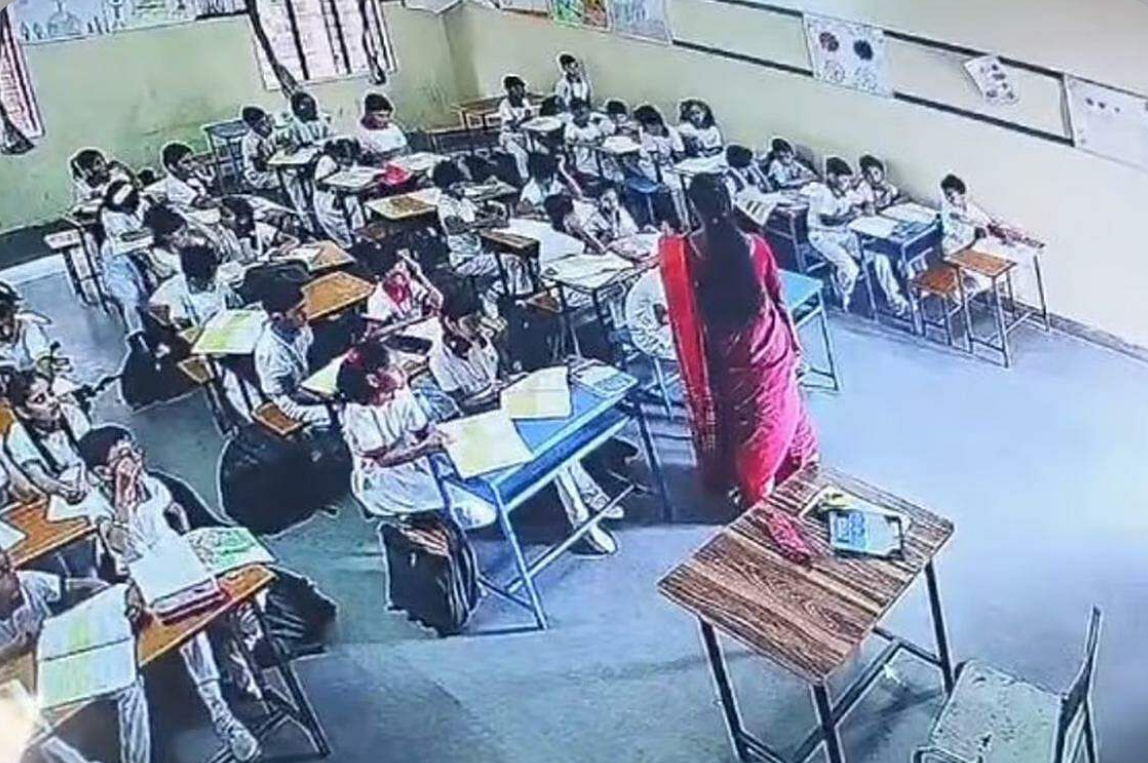 அஷ்டா பகுதியில் அமைந்துள்ள தனியார் பள்ளியில் இந்தச் சம்பவம் நேர்ந்தது. இந்தச் சம்பவம் முழுவதும் பள்ளி வகுப்பறையில் பொருத்தப்பட்டிருந்த கேமராவில் பதிவாகியிருக்கிறது. இது சமூக வலைத்தளங்களில் பரவி கடும் அதிர்ச்சியை ஏற்படுத்தியிருக்கிறது.