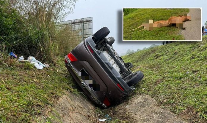 Beliau berkata, kereta Perodua Bezza dipandu suami mangsa berusia 61 tahun, dikatakan cuba mengelak bangkai lembu di tengah jalan sebelum terbabas ke laluan bertentangan.”Kenderaan itu kemudian terbalik lalu masuk ke longkang.