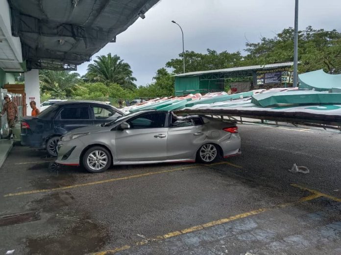 “Bomba menerima panggilan jam 3.44 petang. Menurut laporan awal, terdapat sebuah papan tanda pasar raya telah jatuh dan menghempap enam kenderaan di kawasan parkir iaitu dua Proton Saga, Toyota Vios, BMW, Perodua Myvi dan Jaecoo,” katanya.