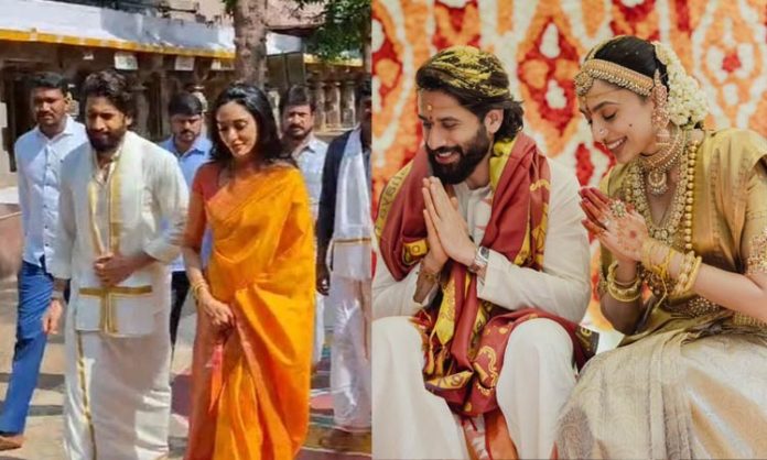 இவர்களது திருமணம் கடந்த 4-ந் தேதி ஐதாராபாத்தில் உள்ள அன்னபூர்ணா ஸ்டுடியோவில் நடைபெற்றது. இந்த திருமண நிகழ்ச்சியில் கலந்து கொண்ட பிரபலங்கள் மணமக்களை வாழ்த்தினர். அதன்பின்னர், நாக சைதன்யா மற்றும் சோபிதா திருமண புகைப்படங்களை நாகார்ஜுனா தனது எக்ஸ் பக்கத்தில் பகிர்ந்து இருந்தார். அந்த புகைப்படங்கள் இணையத்தில் வைரலாகி வருகின்றன.