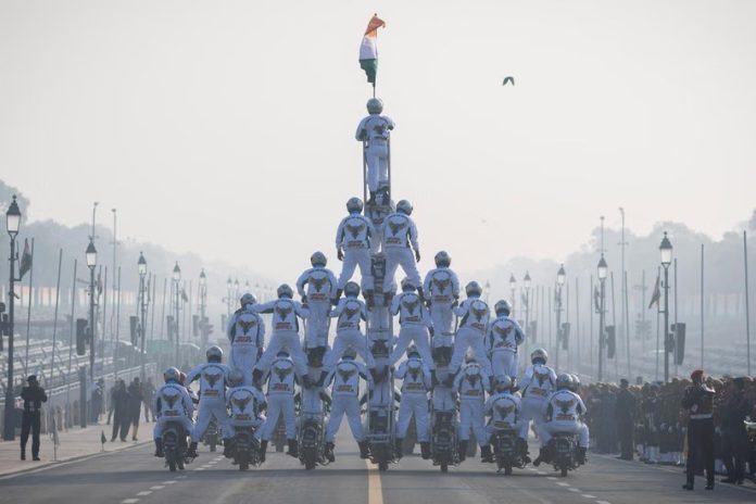 ஏழு மோட்டார் சைக்கிள்களில் 40 வீரர்கள் ஒருவர்மீது ஒருவர் ஏறி 20.4 அடி உயர பிரமிட் வடிவில் நின்று இரண்டு கிலோமீட்டர் தூரம் வரை சென்றனர். இந்தியா கேட் பகுதியில் உள்ள கார்த்திவ்யா பாத்தில் இருந்து விஜய் சௌக் வரை அந்த மனிதக் கோபுரம் நகர்ந்து சென்றது.