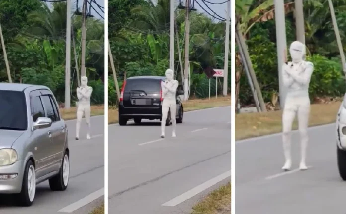 Terdahulu, seorang individu yang berjalan kaki dalam keadaan berbalut seperti mumia, menimbulkan tanda tanya kepada penduduk setempat dan pengguna jalan raya,semalam.
