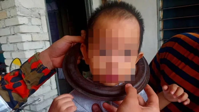 Keluarga seorang budak lelaki berumur setahun berdepan detik cemas selepas besi pelapik tungku dapur gas tersangkut di leher budak itu di rumah mereka, hari ini.