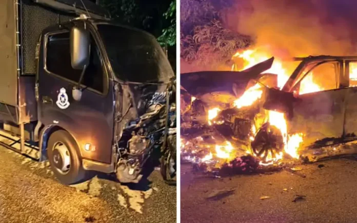 “Kemalangan membabitkan sebuah kereta Kia Sorento yang terbakar akibat bertembung dengan lori milik polis.