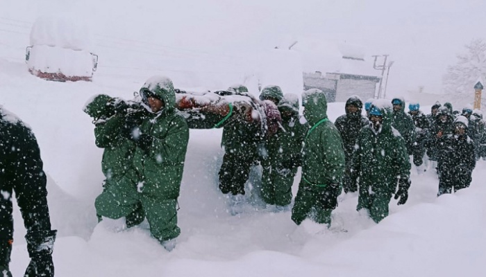 அப்பகுதியில் கடுமையான பனிப்பொழிவு நிலவி வந்த நிலையில், வெள்ளிக்கிழமை காலையில் ஏற்பட்ட பனிச்சரிவில் எல்லைச் சாலை நிர்மாணிப்பு தொழிலாளர்கள் தங்கியிருந்த முகாம் புதைந்தது. அங்கு கூடாரங்களில் இருந்த 55-க்கும் மேற்பட்ட தொழிலாளர்கள் பனிச்சரிவில் சிக்கினர்.