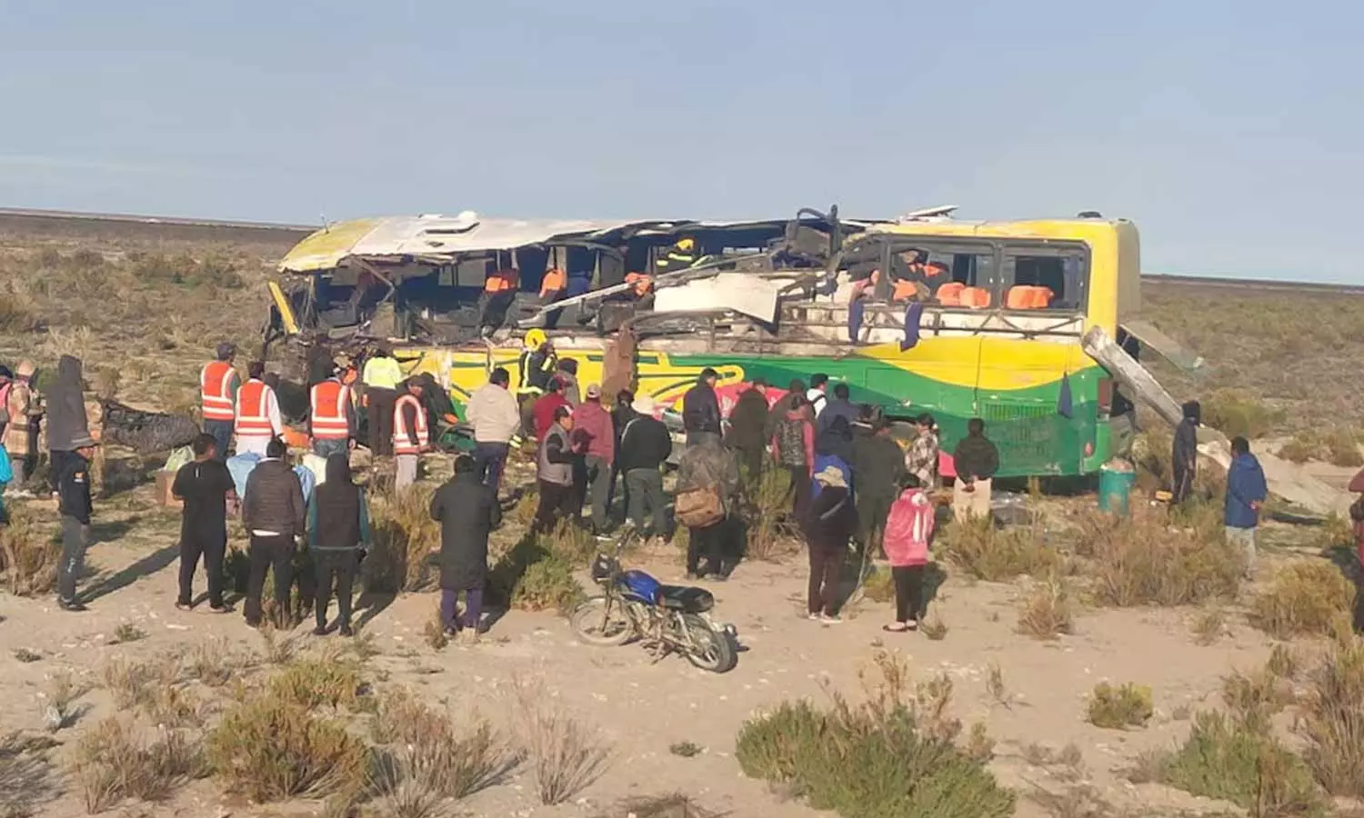 பொலிவியா நாட்டின் மேற்கு போடோசி பிராந்தியத்தில் உள்ள உயுனி-கோல்சானி நகரங்களுக்கு இடையே நெடுஞ்சாலையில் பஸ் ஒன்று சென்று கொண்டிருந்தது. அப்போது கட்டுப்பாட்டை இழந்த பஸ் தாறுமாறாக ஓடி எதிர் திசையில் பாய்ந்தது. இதில் மற்றொரு பஸ் மீது நேருக்கு நேர் மோதியது.
