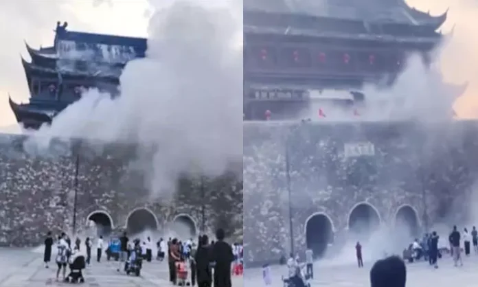 ஏராளமானோர் அங்கு சுற்றுலா சென்றிருந்த நிலையில் திடீரென அதன் மேற்கூரை சரிய தொடங்கியது. இதனை பார்த்த பொதுமக்கள் அங்கிருந்து அலறியடித்துக் கொண்டு ஓட்டம் பிடித்தனர். சற்றுநேரத்தில் அந்த கோபுரத்தின் மேற்கூரை முழுவதும் இடிந்து தரைமட்டமானது.