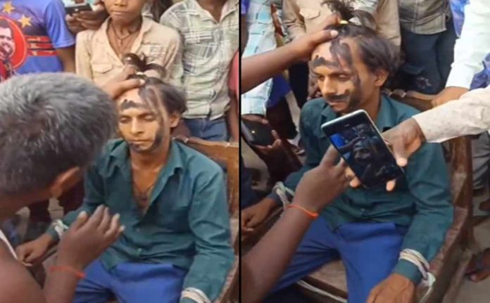இதில் ஆத்திரமடைந்த உறவினர்கள், அந்த இளைஞரை வெளியே இழுத்து, சரமாரியாக அடித்து கயிறுகளால் நாற்காலியில் கட்டி வைத்தனர். இதையடுத்து இளைஞரின் தலைமுடியை வழித்து முகத்தில் கரியைப் பூசினர்.
