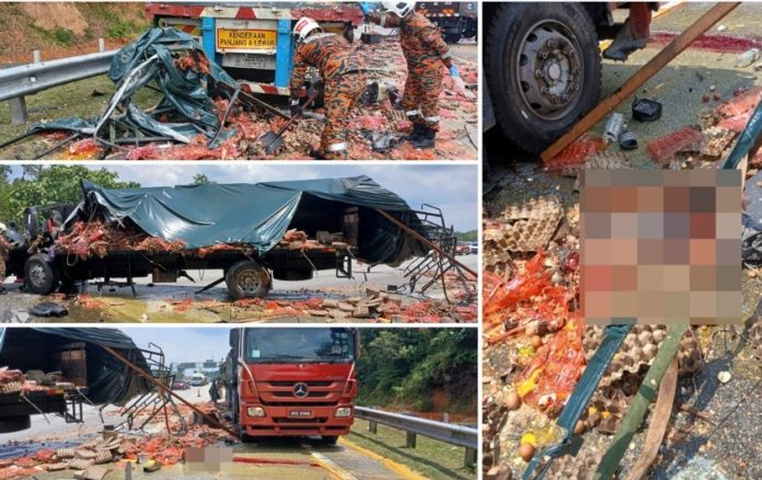 மொத்தம் நான்கு பேர் இருந்த முட்டைகள் ஏற்றிய 10 டன் லோரி, சாலையோரத்தில் நிறுத்தியிருந்த சிமெண்ட் டிரெய்லர் லோரியின் பின்பகுதியில் மோதி விபத்து ஏற்பட்டது. இதில் இருந்த இருவர் லோரியிலிருந்து வீசப்பட்டு உயிரிழந்தனர்.