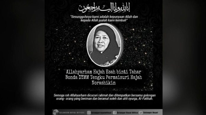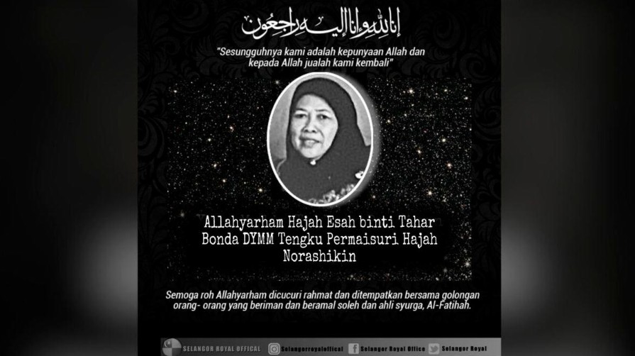 சிலாங்கூர் பெர்மைசூரி தெங்கு பெர்மைசூரி Norashikin அவர்களின் தாயார் Esah Tahar அவர்கள் தனது 82ஆவது வயதில் இன்று மறைந்தார்.