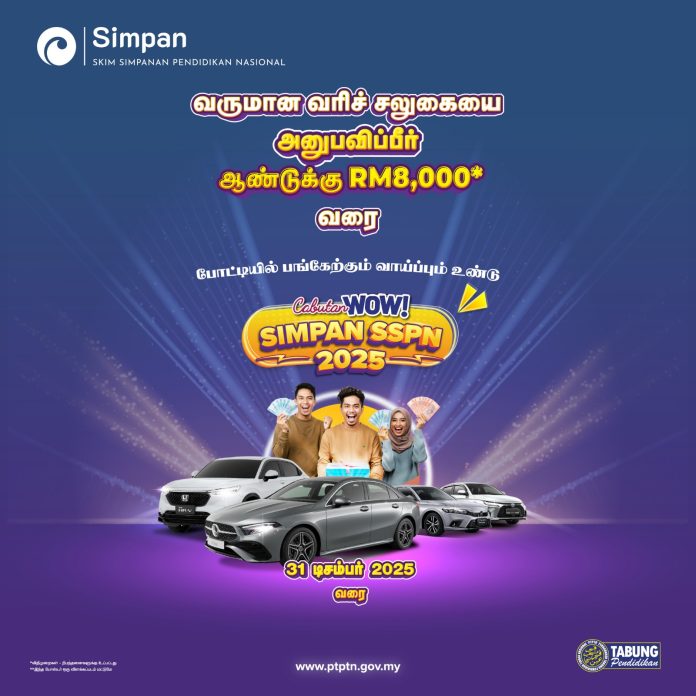 WOW குலுக்கில் பங்கேற்பீர் – 1.5 மில்லியன் ரிங்கிட் மதிப்பிலான பரிசுகளை அள்ளிச் செல்வீர்! Simpan SSPN வைப்புத் தொகையாளர்கள் Cabutan Tahunan WOW எனும் குலுக்கலில் பங்கேற்கும் வாய்ப்பைப் பெறுகின்றனர். Simpan SSPN 2025 குலுக்கல் 31 டிசம்பர் 2025 வரை நடைபெறும். 550 வெற்றியாளர்களுக்கு 1.5 மில்லியன் ரிங்கிட் மதிப்பிலான கவர்ச்சிகரமான பரிசுகள் காத்திருக்கின்றன.myPTPTN ஆன்லைன் வழி எளிமையாக, விரைவாக, பாதுகாப்பாக Simpan SSPN கணக்கு திறக்கலாம், வைப்புத் தொகையை அதிகரிக்கலாம்.